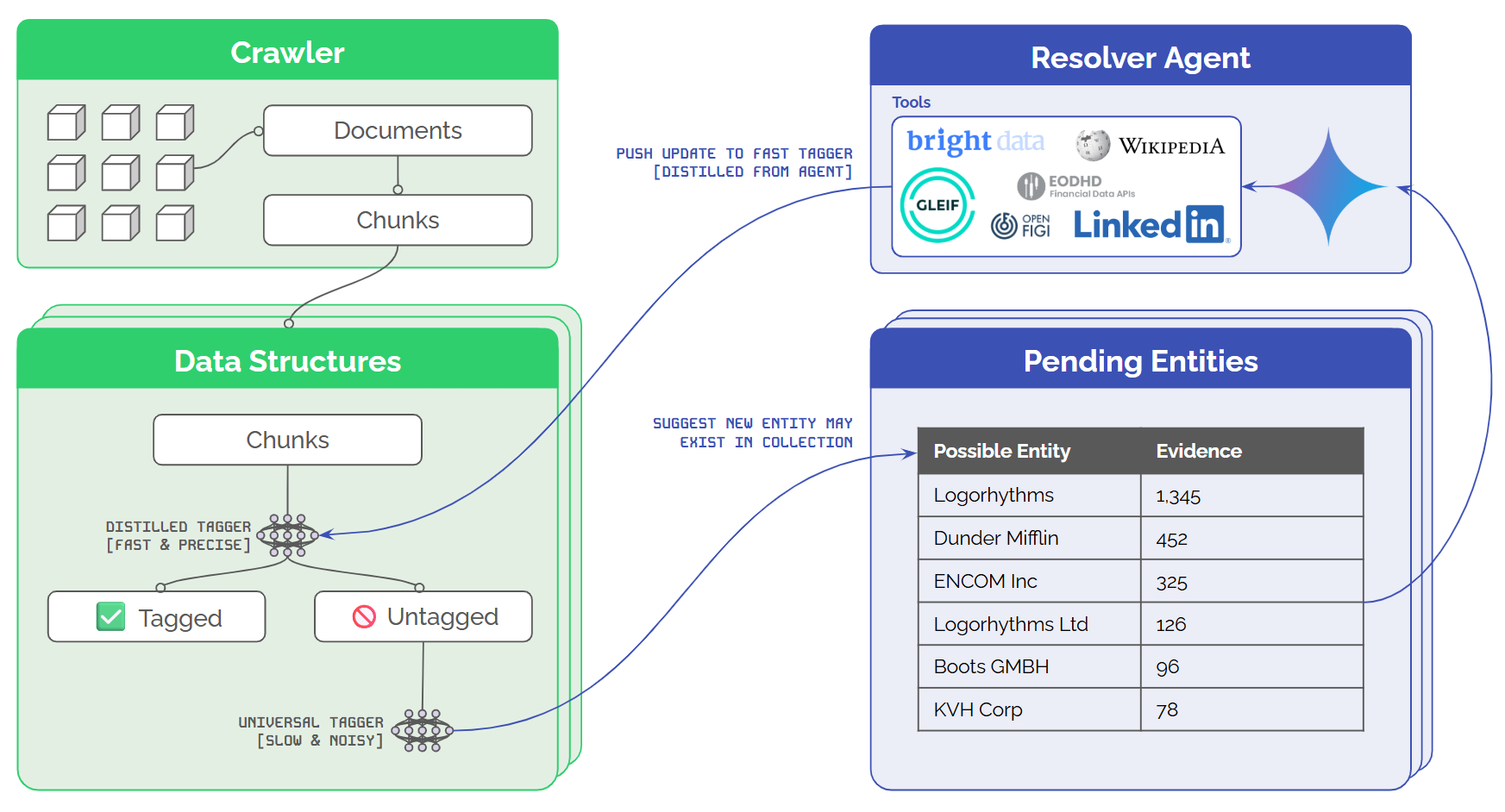 - The slow, universal tagger suggests entities for each collection. Those suggestions are accumulated in a small database and, once a certain threshold is met, the suggestion is sent to the Resolver Agent.