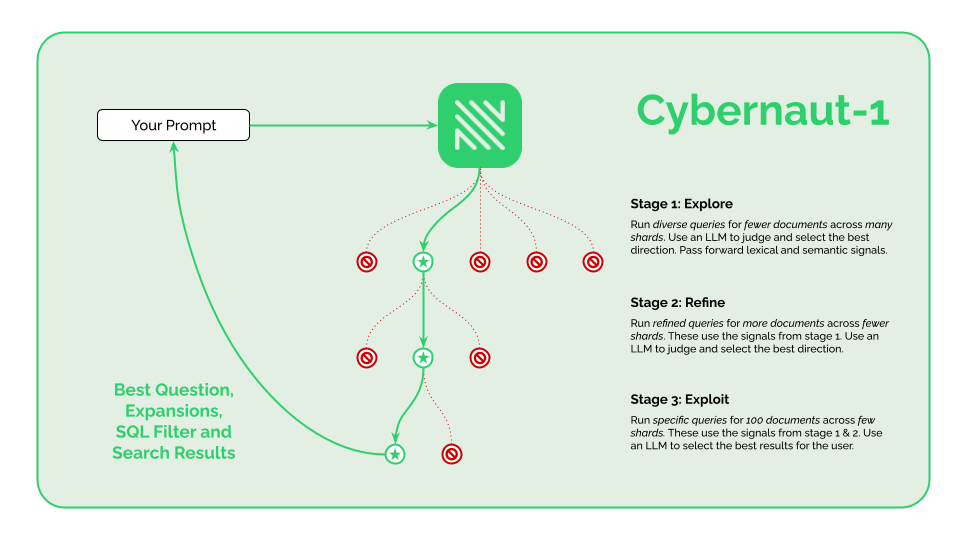 Today I am proud to announce the release of Cybernaut-1. Cybernaut-1 combines our powerful hybrid-3 search algorithm with LLM-guided Monte Carlo Tree Search to deliver world class search results on difficult queries. Cybernaut-1 is available via our V2 Search API and our Python Package.
