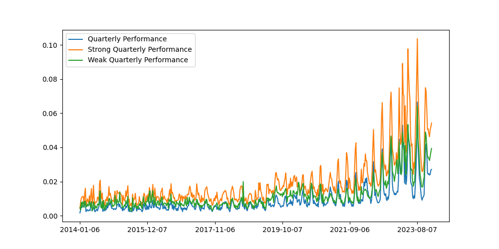 Secondly, there is a lot of cyclicality in text that relates to company performance. For example, when you look at the trend of snippets that relate to “beat analyst estimates” you can clearly see when we are in earnings seasons or not.